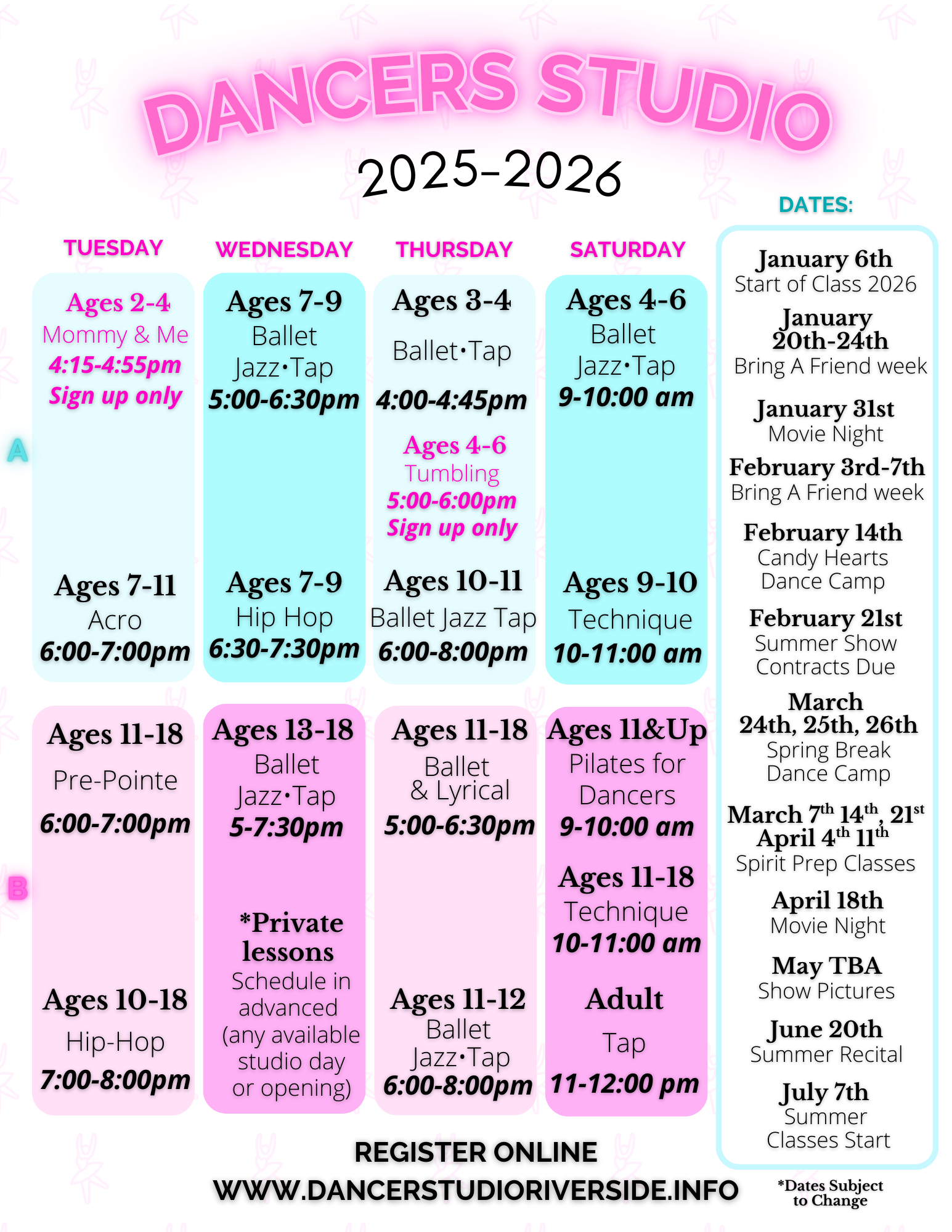 Summer classes & Intensives are part of a 6 week session, which requires separate sign up. Dancers Studio schedule aligns with RUSD breaks/holidays.